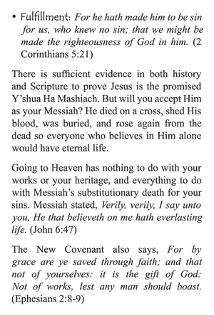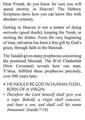 Are you looking for a way to give the gospel to your Jewish friends or co-workers? With Scriptures from the Old Testament and a simple way of explaining the Gospel, they will come face to face with Jesus and how He fulfills the prophecies found in the Hebrew Scriptures.
