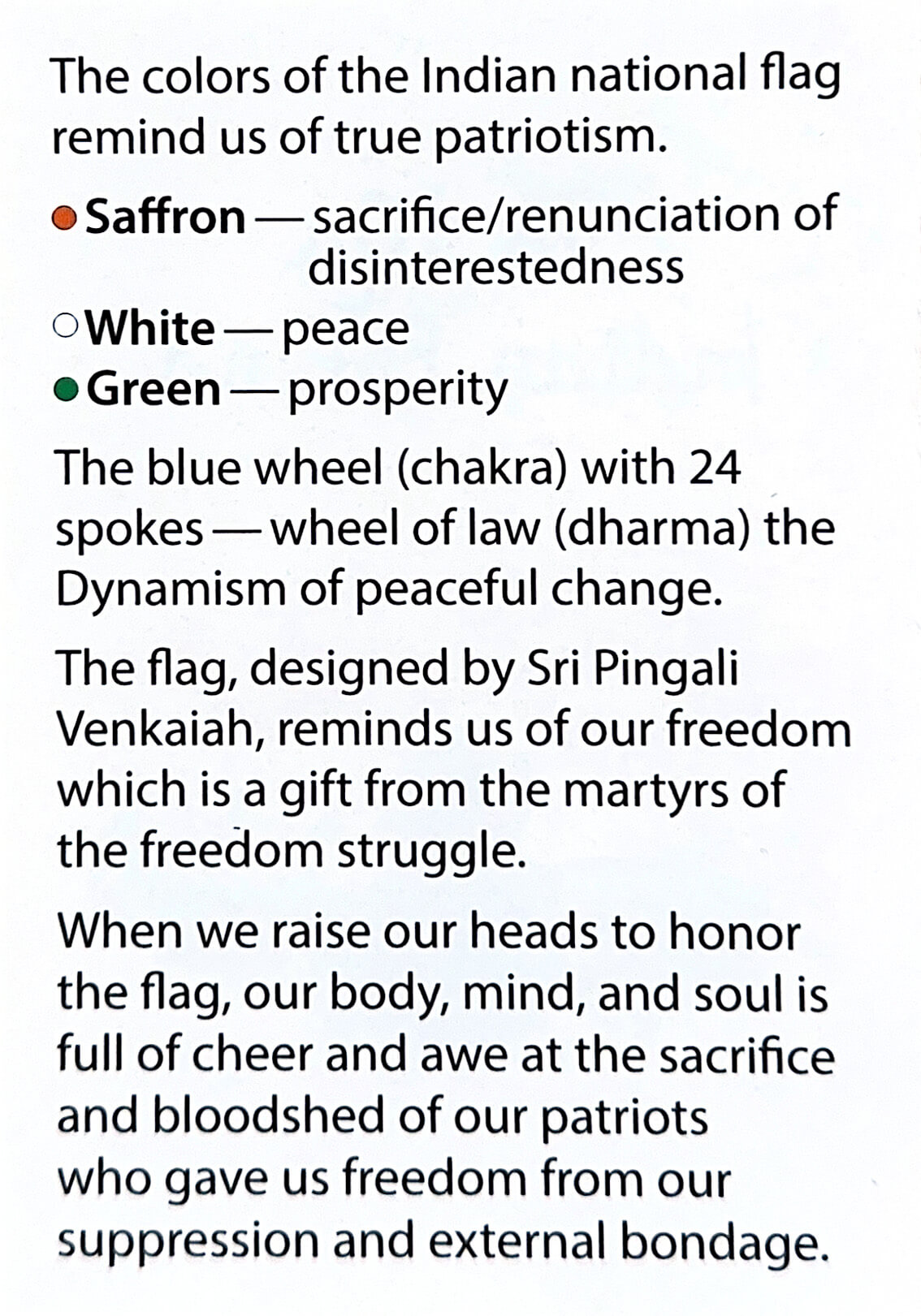 When we raise our heads to honor the flag, our body, mind, and soul is full of cheer and awe at the sacrifice and bloodshed of our patriots who gave us freedom from our suppression and external bondage.