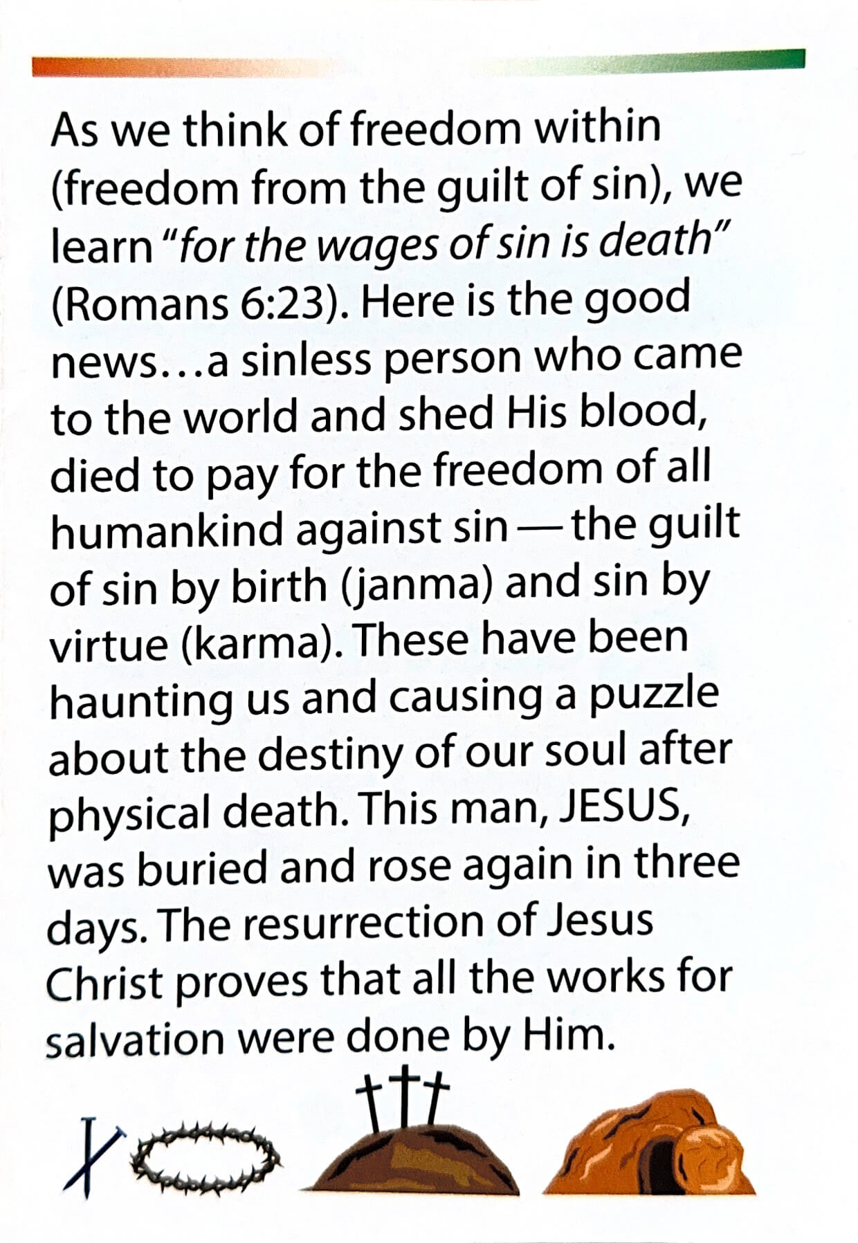 This gospel tract uses the Indian flag to help picture the freedom we have in Christ. This tract provides an opportunity to share the gift of true freedom provided by the death, burial, and resurrection of Jesus Christ.