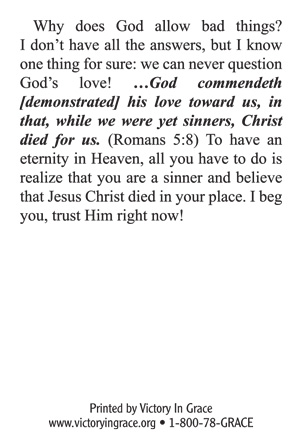 Have you ever been asked the question, “Why would a loving God allow bad things to happen?” This special gospel tract will aid you in answering that question, as well as presenting the clear gospel message.